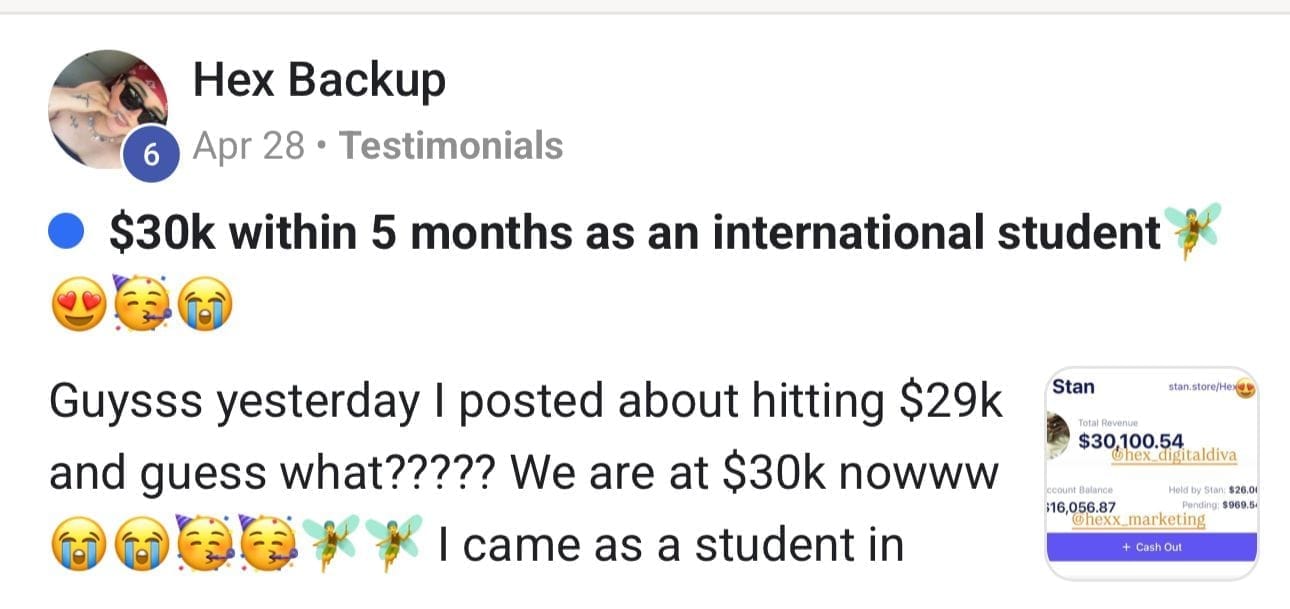 This course actually comes with its own community of 48,000+ people where you can ask questions & network. In addition to that, if you get the course with me, you will be added into my PRIVATE CHANNEL you'll receive my group chat with weekly calls! I want to see you become a success story!